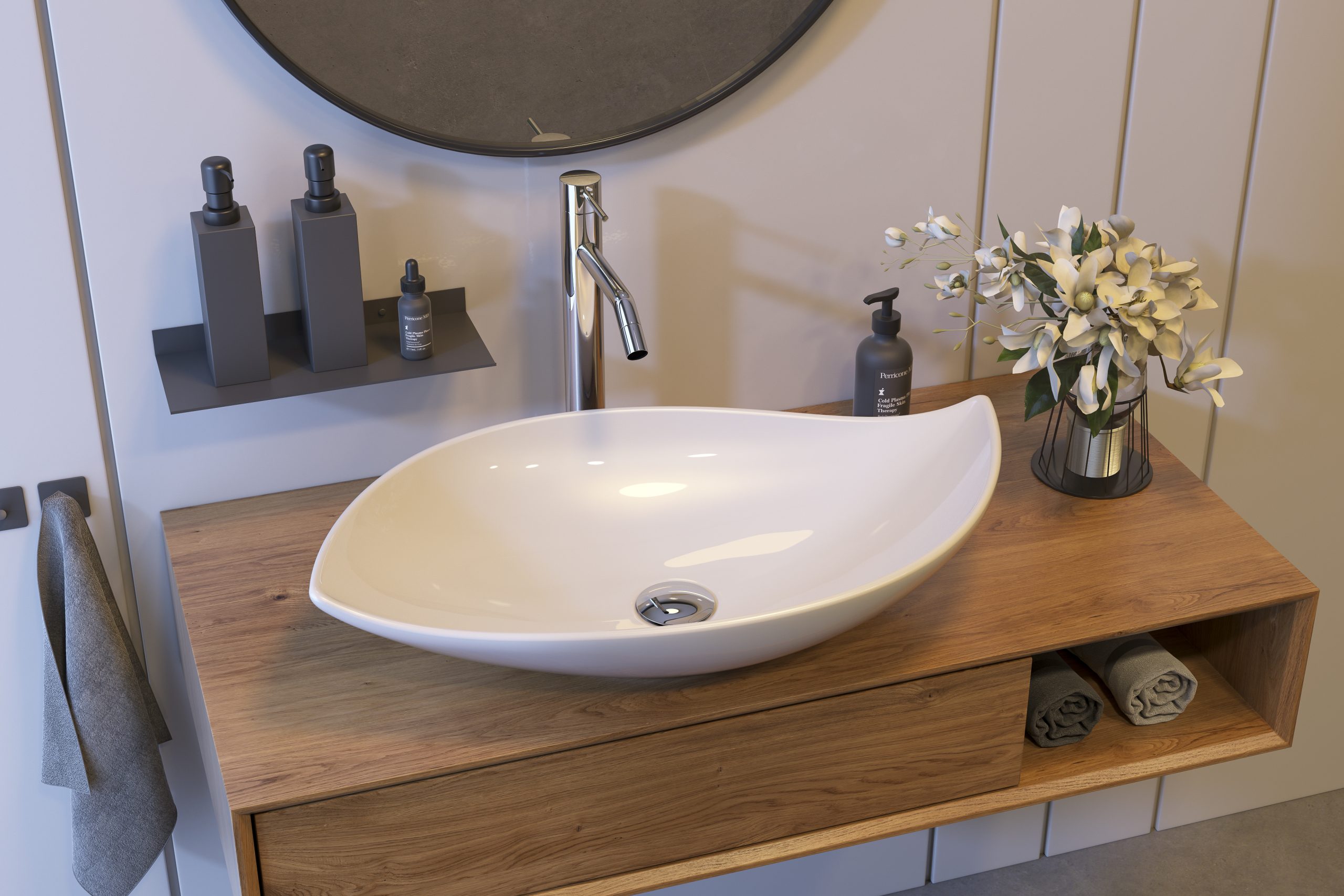Atypické keramické umyvadlo bez otvoru pro baterii, bez přepadu.