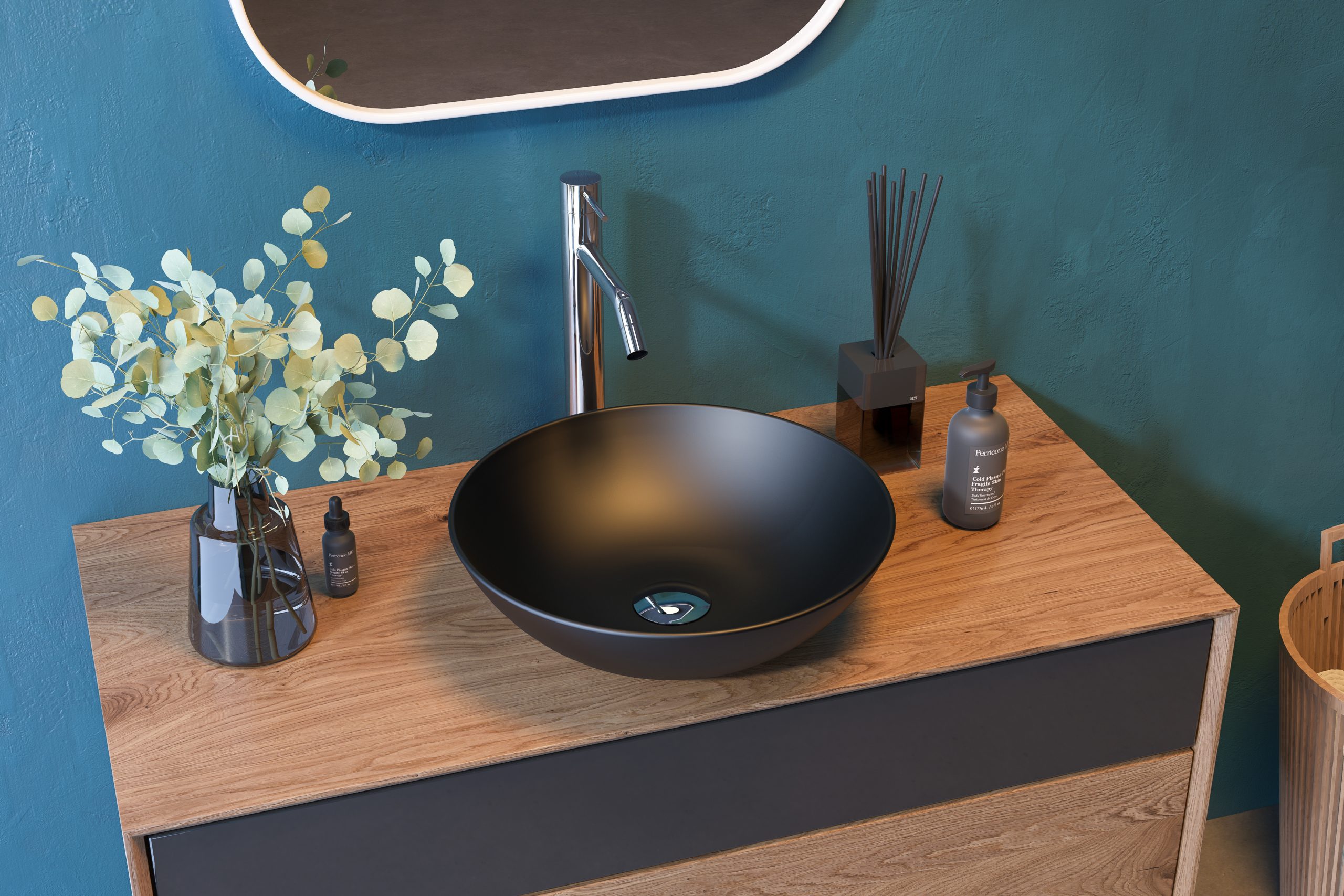 Kruhové keramické umyvadlo bez otvoru pro baterii, bez přepadu.