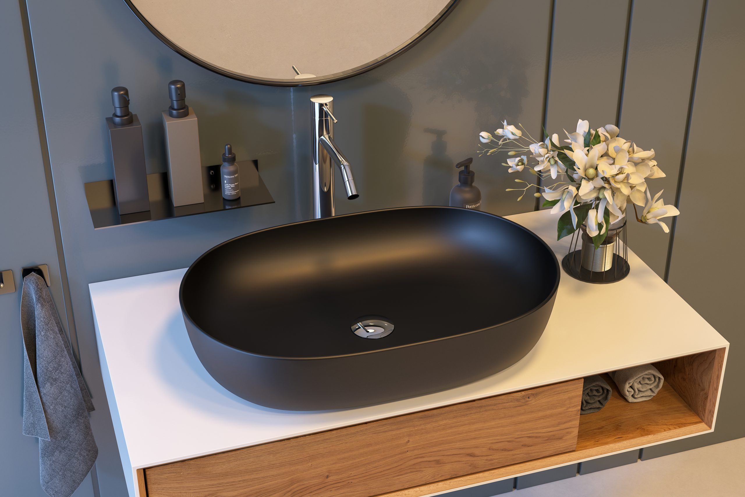 Oválné keramické umyvadlo bez otvoru pro baterii, bez přepadu.