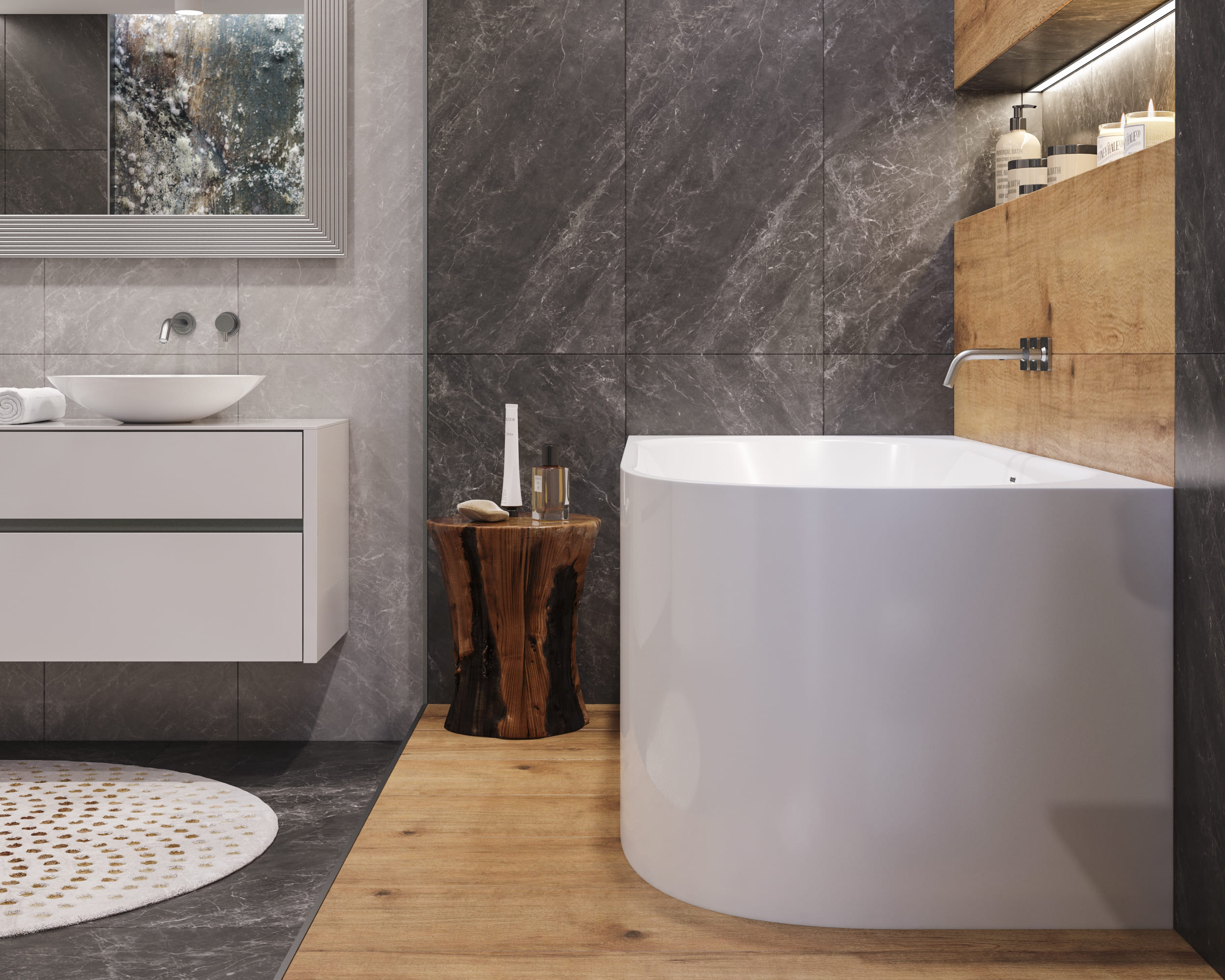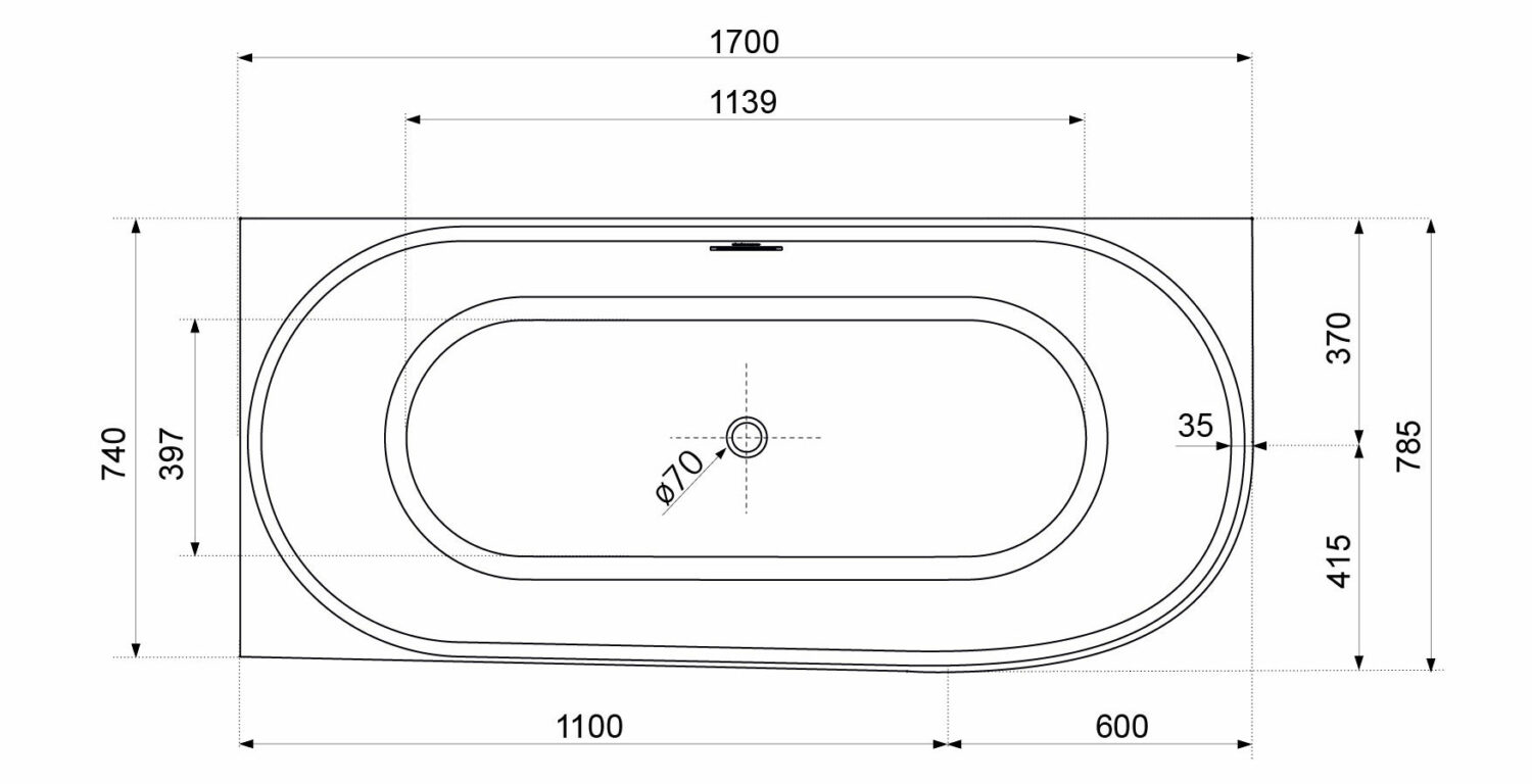 Rohová vana s integrovaným (neodnímatelným) čelním panelem, se stabilní podpůrnou hliníkovou konstrukcí, s možností napojení na odpadní potrubí nejen v podlaze, pod dnem vany, ale také do bočních stěn koupelny, zda na krátké, nebo delší zadní straně vany. Obdélníkový tvar vany na jedné straně se zaobleným rohem ušetří vnější prostor bez omezení vnitřního pohodlí.