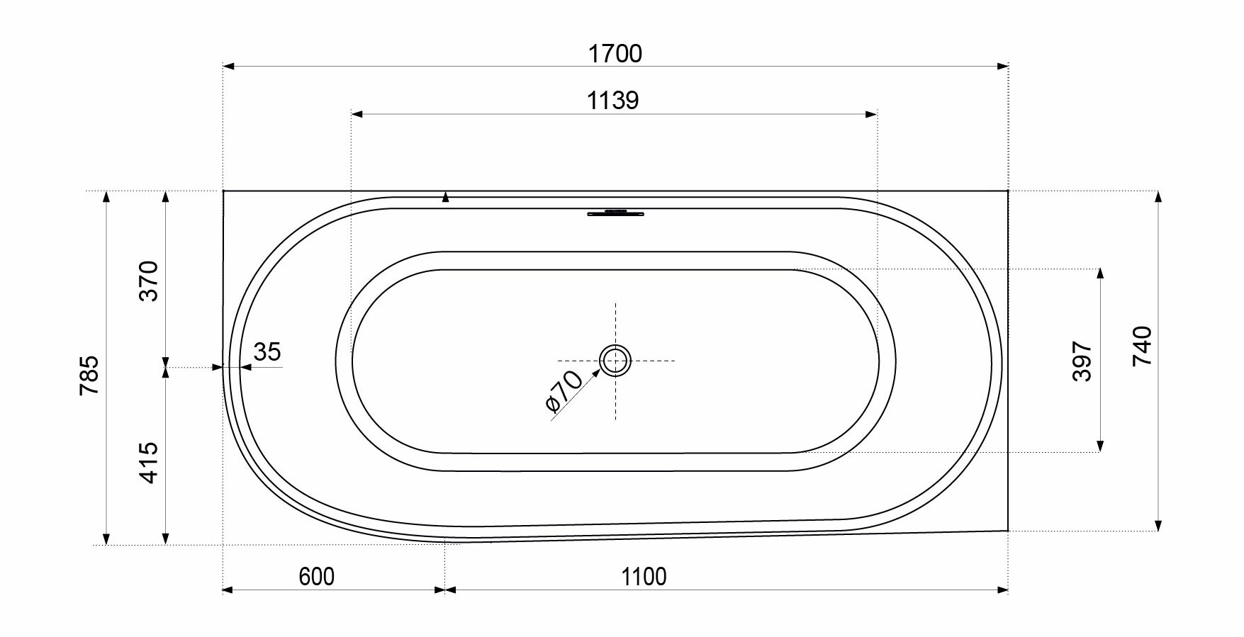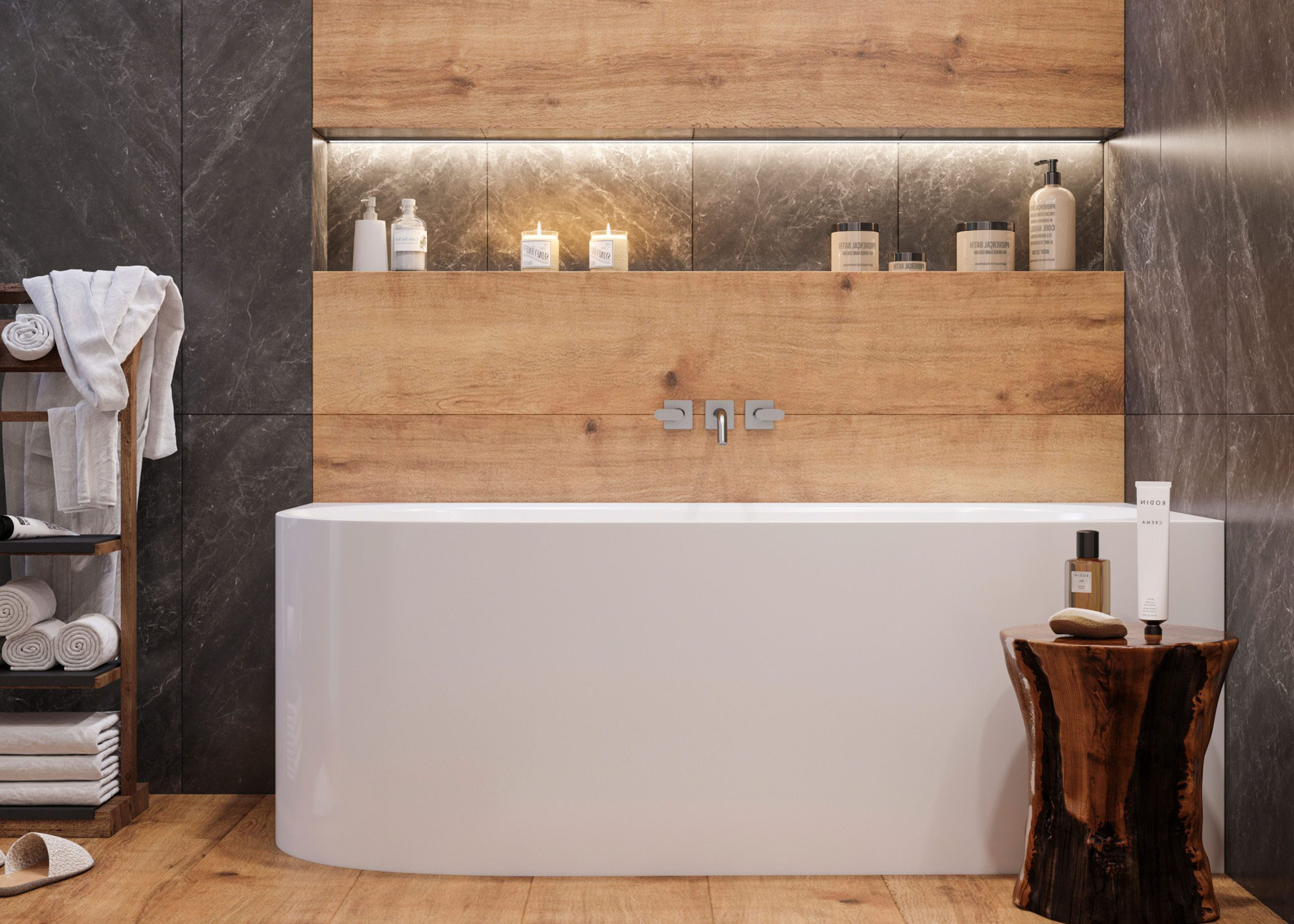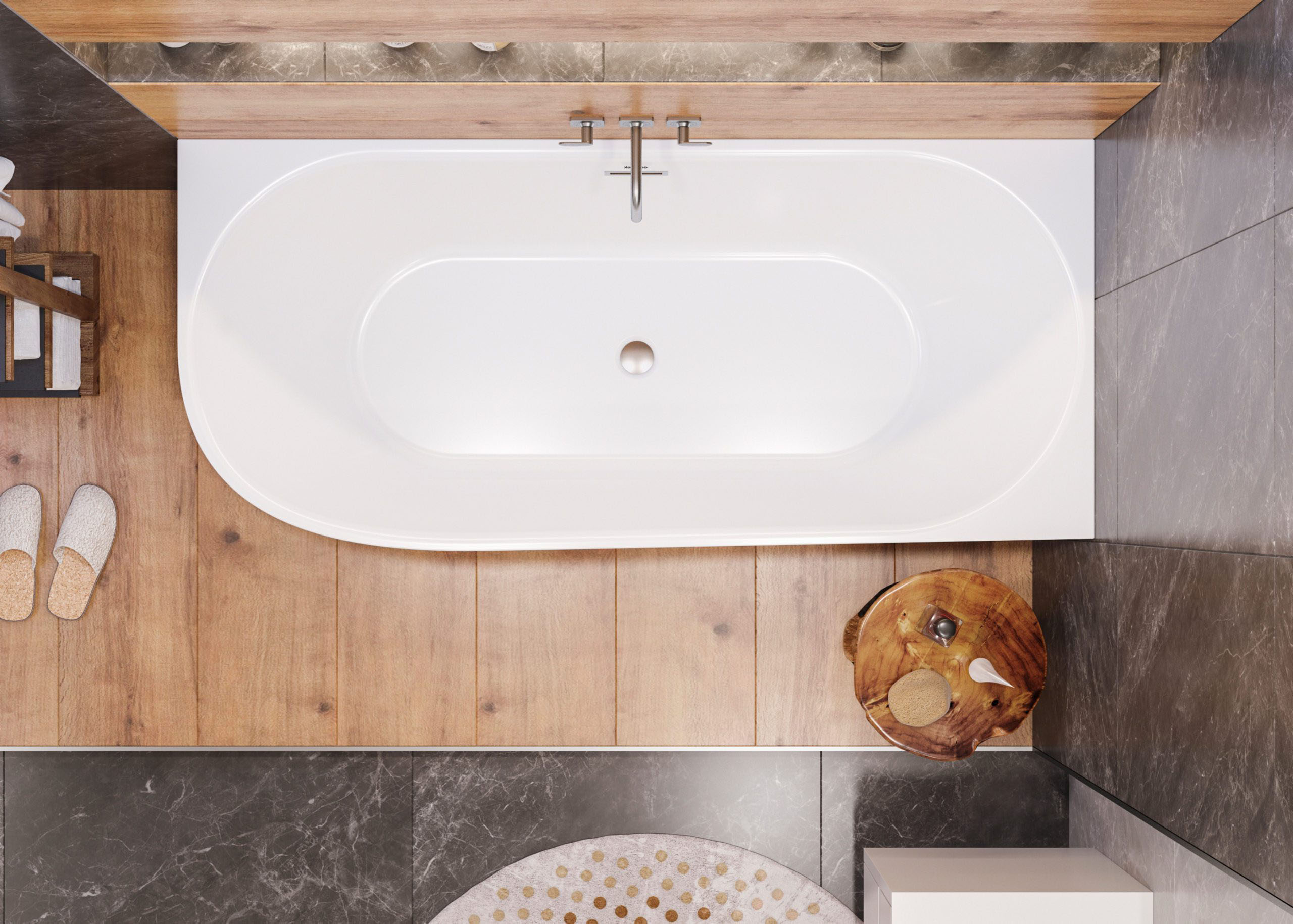 Rohová vana s integrovaným (neodnímatelným) čelním panelem, se stabilní podpůrnou hliníkovou konstrukcí, s možností napojení na odpadní potrubí nejen v podlaze, pod dnem vany, ale také do bočních stěn koupelny, zda na krátké, nebo delší zadní straně vany. Obdélníkový tvar vany na jedné straně se zaobleným rohem ušetří vnější prostor bez omezení vnitřního pohodlí.